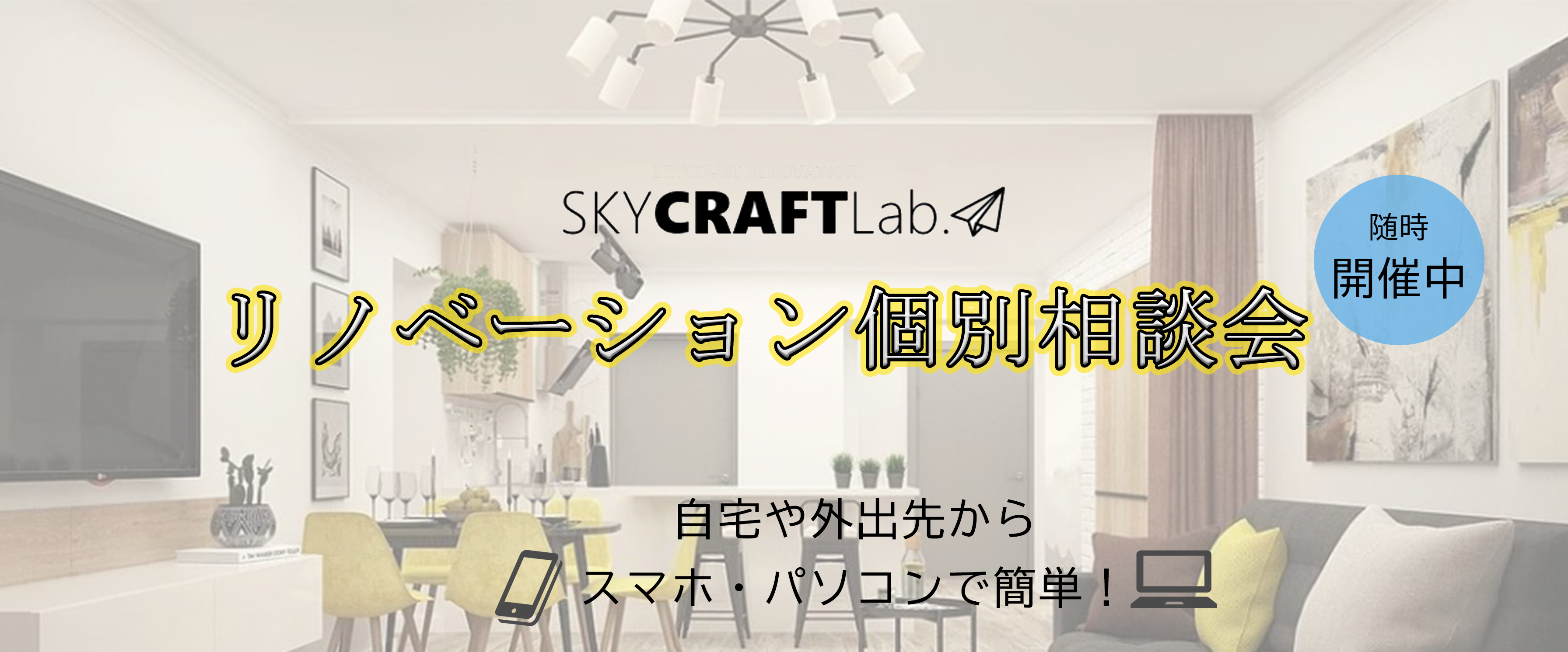 リノベーション個別相談会開催中 スカイクラフトラボでは常時個別相談会を実施しております。ご希望の日時などCONTACTよりご予約ください。お電話による予約、WEB相談会もご希望により実施しておりますので、お気軽にご相談下さい。 現在リノベ工事費用がお得になる「モニターキャンペーン」も実施中です!